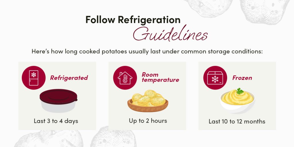 Cooked potatoes spoil much faster than raw ones. Always refrigerate them promptly to lower food safety risks. Once cooked, how and where you store potatoes affects their safety and quality. To keep both quality and safety, refrigerate cooked potatoes as soon as they cool and reheat thoroughly before eating. Here’s how long cooked potatoes usually last under common storage conditions: